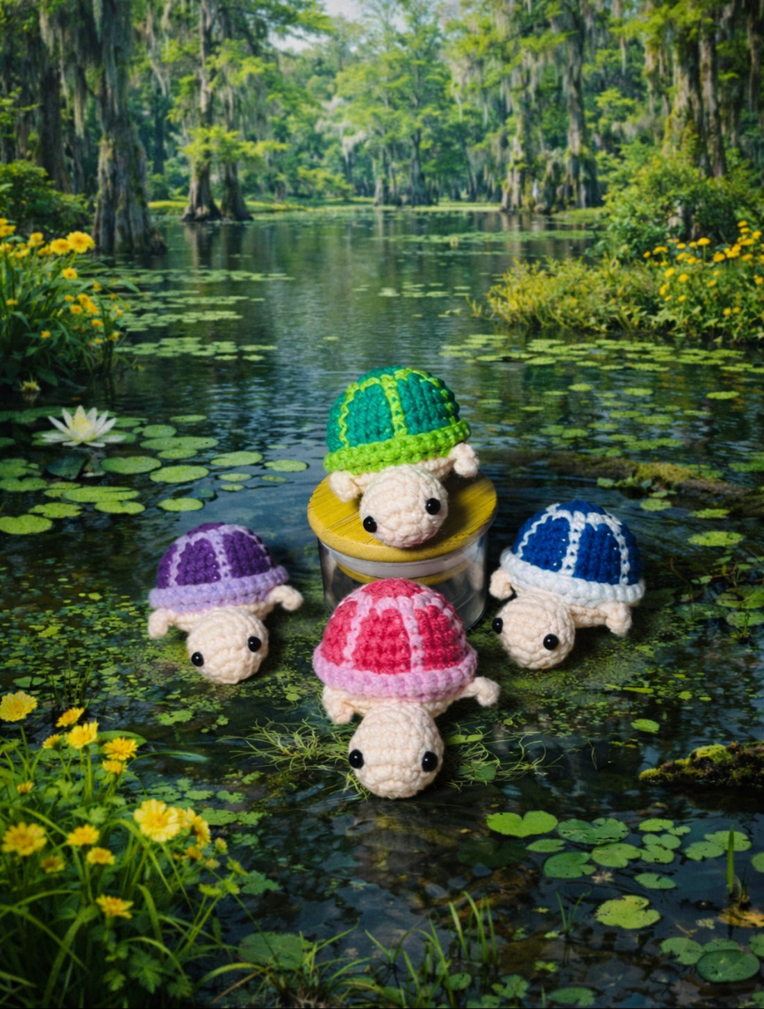 Meet the Spring Swamp Turtle Family, a charming set of hand-crocheted turtles nestled in a...